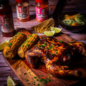- Knip de ruggengraat uit de kip en druk hem plat (spatchcock)
